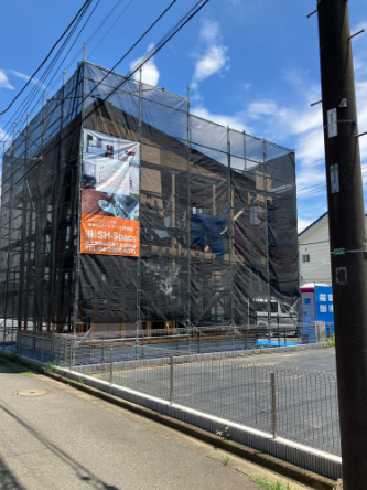 そして足場に「安全第一」と「SH-SpaceのPRシート」を張り、、、